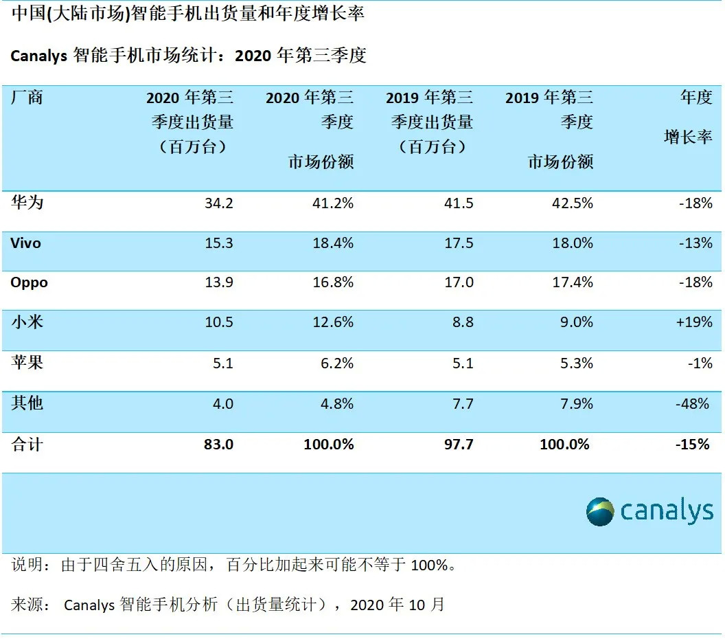 研究机构Canalys的数据显示,2020年第二季度,华为手机在全球市场上首次夺冠,但在欧洲市场,自去年谷歌在中国以外的市场给华为断供,华为便被迫失去了离不开谷歌全家桶的国外用户。第二、第三季度小米出货量接连同比暴增65%、91%,把华为“挤”出了三甲之列,OPPO在三季度也以接近396%的同比涨幅一跃闯进前五。