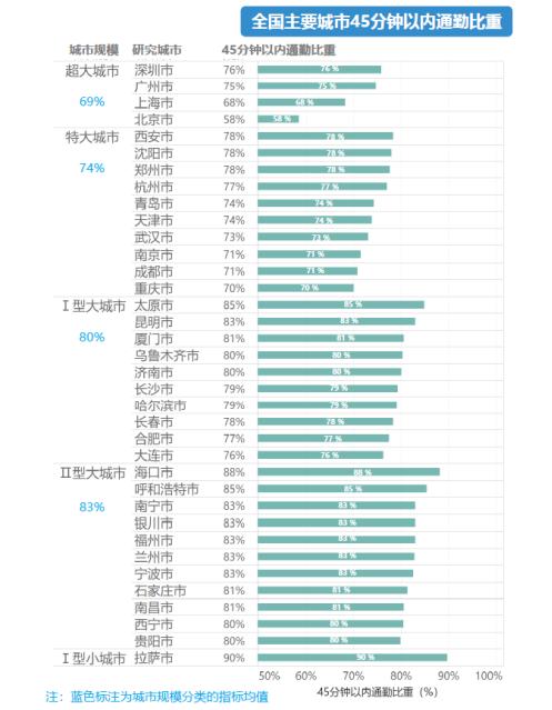 但从报告的数据来看,36个全国主要城市45分钟以内通勤人口比重为76%。其中,超大城市45分钟通勤人口比重仅有69%,特大城市74%、Ⅰ型大城市80%、Ⅱ型大城市83%。对于超大和特大城市,距离45分钟通勤覆盖80%-90%的发展目标尚有一定差距。Ⅰ型大城市中的长沙、哈尔滨、长春市、合肥市、大连市,45分钟通勤覆盖也尚未达到同等规模的平均水平。