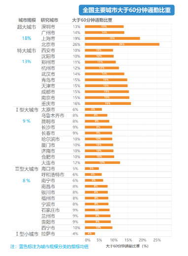 此外,报告也显示,在36个全国重点城市中,共有超过1000万人正在承受60分钟以上的极端通勤之苦,占通勤人口的13%。其中,北京大于60分钟的通勤人口比重达26%,极端通勤情况最为严重,其次是上海、重庆,青岛、天津、成都、南京60分钟以上通勤比重也都在15%及以上。