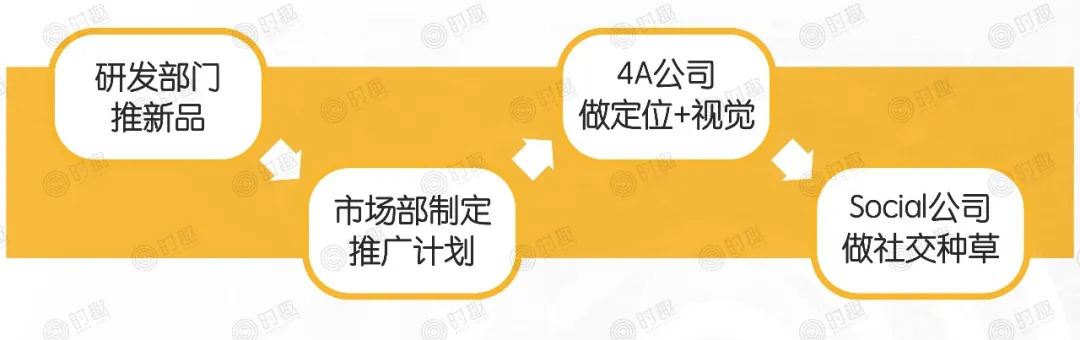 第一种是传统模式,一款新品的上市流程是:研发部门推新品—市场部制定推广计划—4A公司做定位+视觉—Social公司做社交种草。