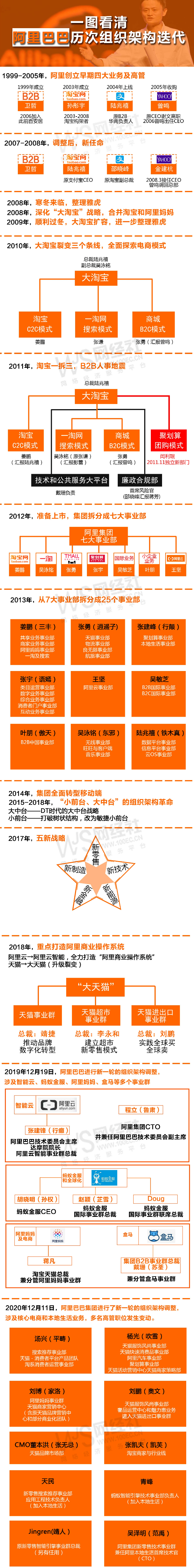 阿里早期创业的团队由18个合伙人组成,随后从“十八罗汉”成长为一个庞大的商业帝国,在阿里生命周期的每一个阶段,其组织结构都在不断的优化。近年来的组织架构调整包括: