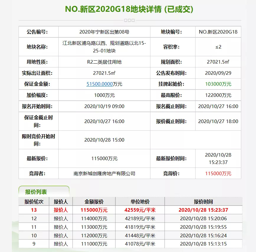 当日下午3时,NO.2020新区G18地块经过重新竞拍,最终被新城以11.5亿元拿下,成交楼面价21279元/㎡。