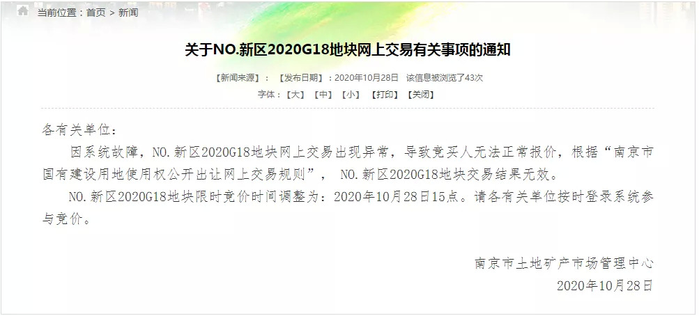 10月28日,上午G18地块原本显示被保利拿下,随后被撤销。根据南京土地市场网公示显示,因系统故障,G18地块网上交易出现异常,导致竞买人无法正常报价,上午竞拍交易结果无效,并安排今天下午3点重新竞标。