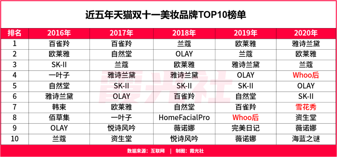 看看今年双十一美妆TOP10,排在第七位的雪花秀也是韩妆品牌。去年,我们还在前十里见不到它的影子。