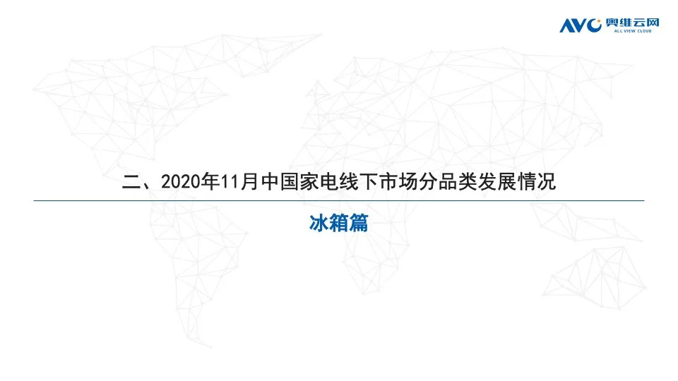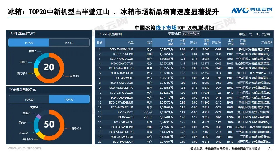 奥维云网(AVC)监测数据显示,2020年11月线下冰箱市场零售额为29.8亿元,同比下降3.9%。零售量55万台,同比下降9.9%。奥维云网(AVC)分析认为,下沉渠道强势分流了四六级市场的需求,推总后,市场走势应远低于监测水平。细分市场中,十字产品份额虽然有所回落,但占比仍超过30%,而在TOP20机型中,新品占据半数,也侧面反映出在需求、价格双向增长的背景下,冰箱市场的产品迭代速度显著提升。
