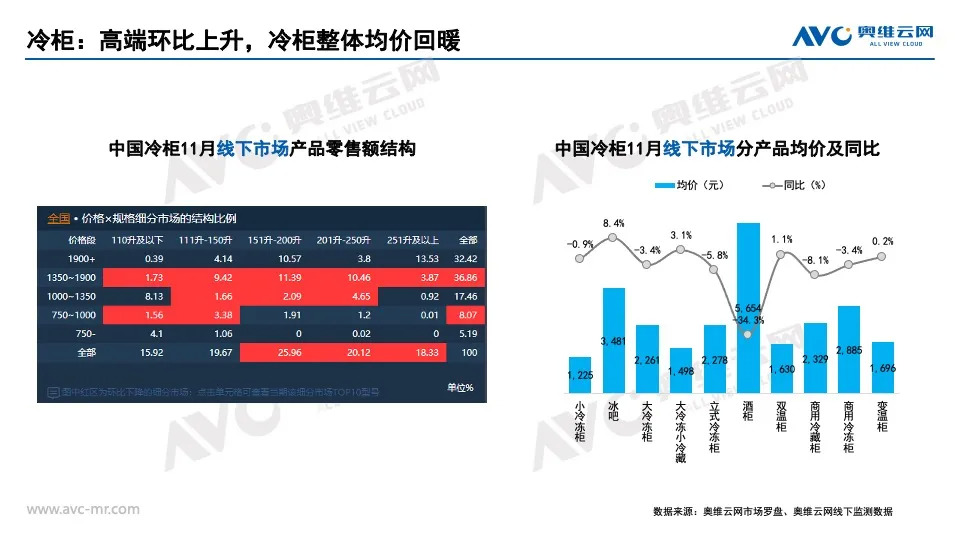 11月线下冷柜市场同比上升。根据奥维云网(AVC)监测数据显示,2020年11月冷柜线下市场零售量为7.6万台,同比上升8.8%,零售额为1.2亿元,同比上升5.0%。其中,小冷冻柜零售额同比上升15.6%;客厅柜中冰吧零售额同比下滑7.2%,酒柜零售额同比上升25.5%。11月线下冷柜均价同比下滑3.5%,冷柜主要品类中小冷柜均价同比上升0.2%、大冷冻柜均价同比下滑3.4%。
