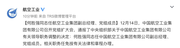 @航空工业 微博消息,12月14日,中国航空工业集团有限公司召开党组扩大会,通报了中央组织部关于中国航空工业集团有限公司有关领导职务调整的决定:何胜强同志任中国航空工业集团有限公司副总经理、党组成员。相关职务任免按有关法律和章程办理。