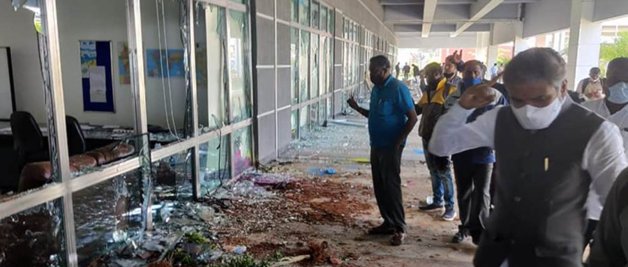 根据目击者现场拍摄的视频来看,抗议示威者打碎了很多玻璃和门窗,并且将汽车掀翻,还袭击了领导办公室。