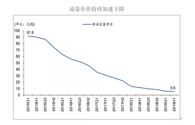 以流量单价为例,2015年移动数据流量单价为91.8元/G,而后单价连年降低。到2019年6月,流量单价已低至5.6元/G。