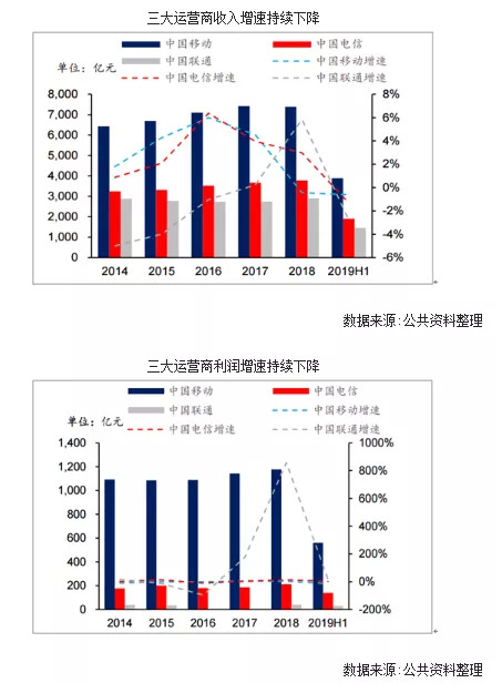 提速降费对于用户而言是一大福音,但也大幅影响了电信运营商的收入。用户流量的增长无法弥补“断崖式”下降的流量单价所带来的营收及利润增速下降。2019上半年,中国移动、中国电信和中国联通营收增速分别降低了0.61%、1.32%和2.78%;从净利润情况看,除了受到混改红利影响的中国联通于2018年净利润大幅提升,中国移动和中国电信净利润增速均有所下降,中国移动则在2019上半年首次出现净利润下滑。