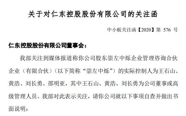 收盘不久后,仁东控股公布了深交所对公司的关注函。