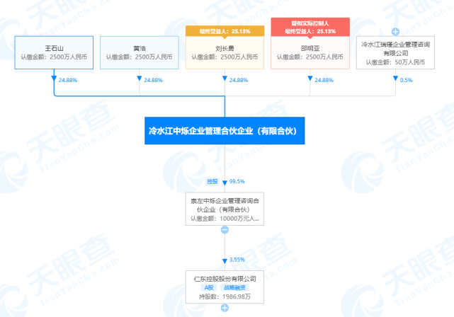 崇左中烁的大股东冷水江中烁成立于2019年10月9日,疑似实控人为邵明亚,王石山、黄浩、刘长勇和邵明亚四人均直接持有其24.88%的股份。