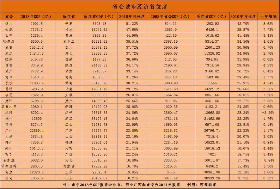 根据西部菌统计的2018年数据,济南、贵阳、南宁都属于GDP相对较低的省会城市。尤其是济南在2019年合并莱芜后,其仍处于首位度垫底的状态。