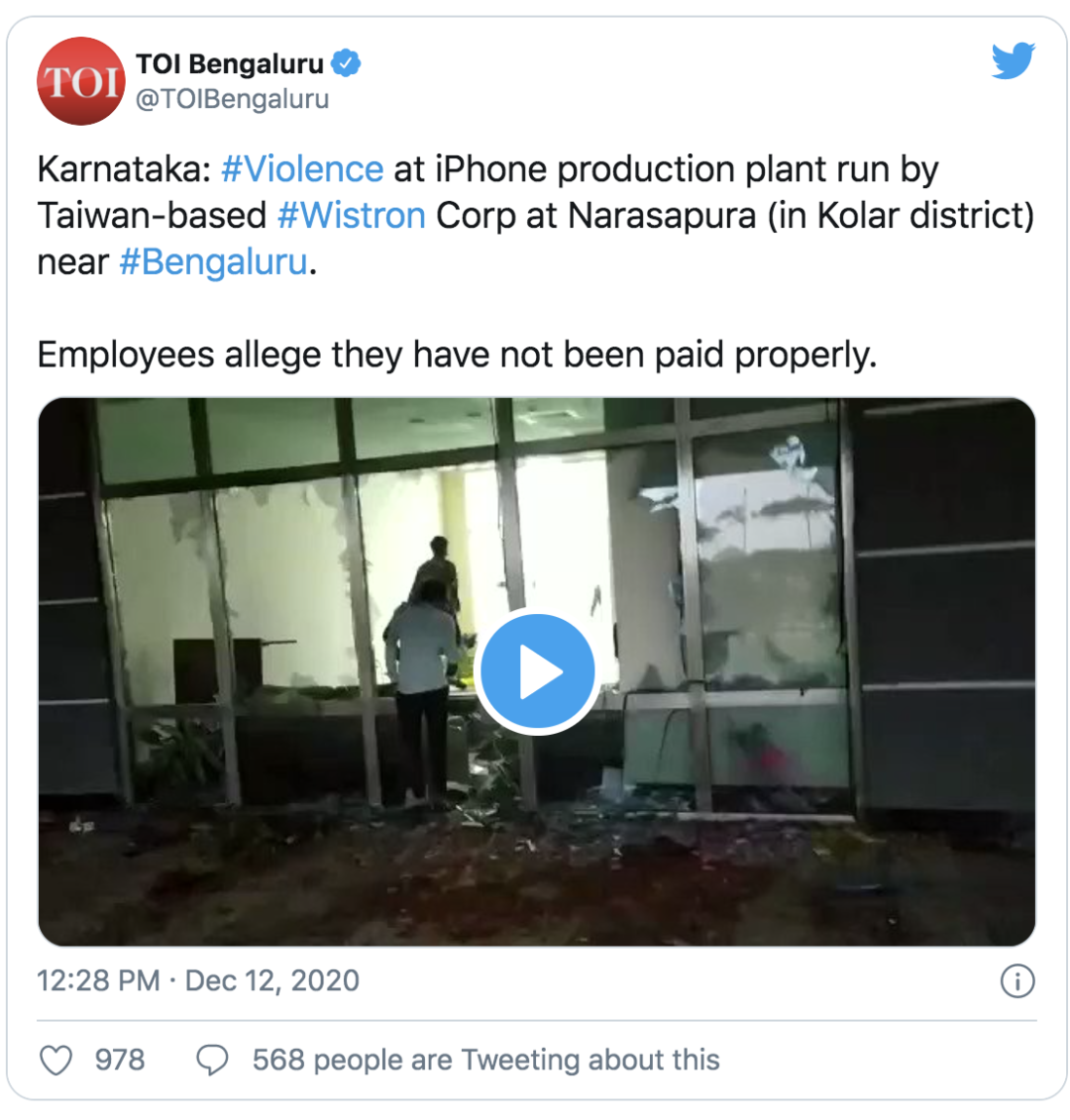 印度媒体报道纬创位于纳尔萨普尔的工厂遭到破坏/Twitter