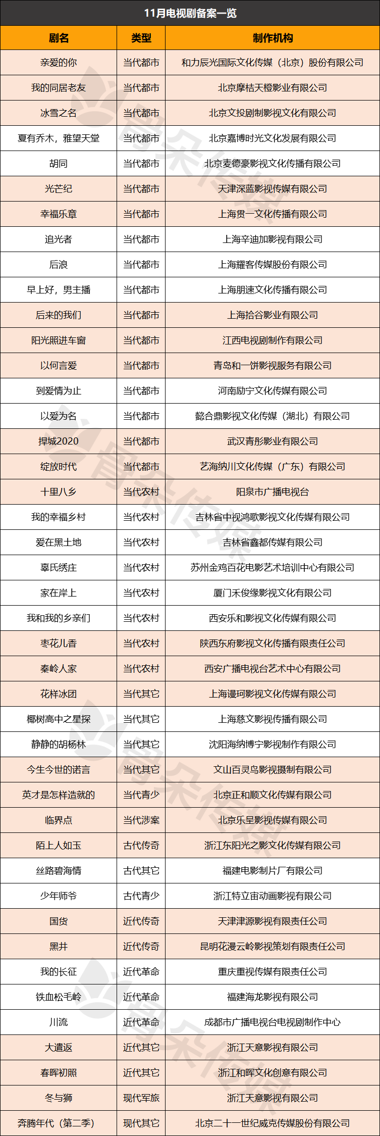当代题材共31部,占到11月电视剧备案数量的72.09%,其中,当代都市题材更是直接达到了17部,耀客传媒、慈文传媒这样的老牌影视公司均有当代题材备案。