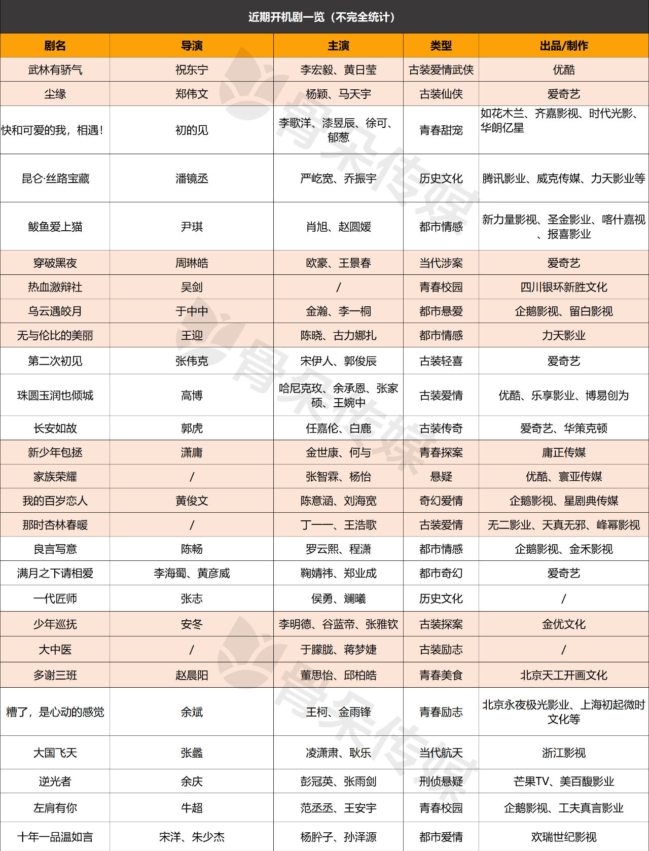 除古装剧外,青春剧和都市剧也是当下开机潮的热门题材。整体来看,人设和剧情创新力度不大,在班底搭建和演员阵容上也维持着以往的风格,走的是求稳的路子。