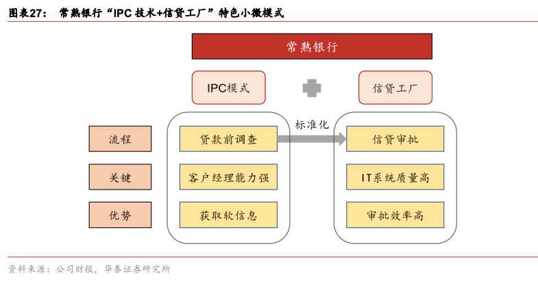 近年来部分中小银行已逐步明确业务定位、聚焦中小微企业,并实施有区域特色的差异化经营策略。例如常熟银行作为小微标杆行,凭借其区域内充足的微贷资源叠加客群下沉战略,铸造了独特的“IPC+信贷工厂”小微模式,形成护城河优势。