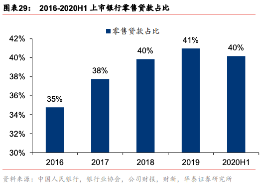 而在经济下行压力加大、对公业务不景气的背景下,银行也开始主动谋求零售业务转型。2016年以来,上市银行零售贷款占总贷款比例逐步提升,2019年末达到41%;2020年以来受疫情影响,零售贷款占比有一定下滑,但二季度之后投放已逐步恢复。目前招商银行、平安银行、常熟银行零售贷款规模已超过50%。我们认为随着消费需求升级,银行业零售转型趋势有望持续,迎接更为广阔的成长前景。