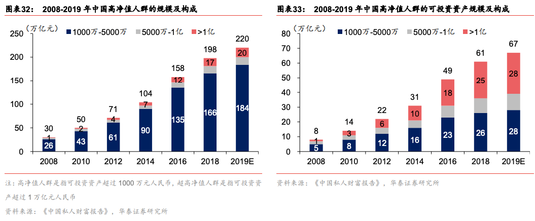 对标海外银行,国内银行财富管理成长空间仍大,未来主动管理转型有望提升盈利能力。随着中国经济快速发展,居民财富不断累积,财富管理需求日益剧增,且客群高端化趋势明显。2008-19年中国高净值人群规模、可投资资产规模CAGR均达20%,而超高净值 人群规模、可投资资产规模CAGR则均超30%,预计有望为财富管理及私行业务创造足量市场前景。