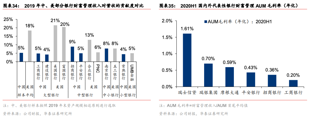 而对比海外成熟市场的银行,国内银行财富管理对收入的贡献度尚有较大提升空间,且AUM毛利率(财富管理收入/平均AUM)相较海外财富管理大行仍有一定差距。目前国内银行财富管理仍以代销模式为主,随着主动管理转型的持续推进,我们预计未来AUM毛利率有望逐步迈上新台阶,财富管理业务的盈利能力有望进一步释放。
