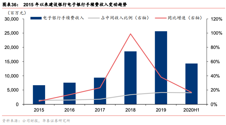 以规模较为领先的建设银行为例,2019年6月推出聚合支付品牌,为商户提供一站式资金结算服务的收单产品,并聚合打车、外卖、影票等高频生活场景。2020年6月末聚合支付有交易商户数达232万户,交易额同比+25.73%至5899亿元;网络支付交易额达8.51万亿元,在支付宝、京东、美团等支付平台的交易额居同业第一。数字支付也为银行中间收入增长奠定了坚实基础,2017 年以来建设银行电子银行手续费收入快速增长(主要得益于网络支付交易额较快提升)。