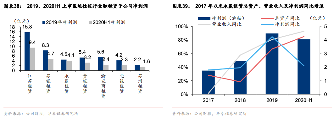 例如宁波银行于2015年成立全资子公司永赢租赁,重点拓展“小微租赁、智能制造、公用事业”三大领域,在渠道、客群等方面与母行的小微及对公业务形成协同联动。在经过近3年的初期磨合后,2019 年以来资产规模、营业收入、净利润均开始实现快速释放,预计未来有望为母行贡献更为丰厚的利润。2020年上半年永赢租赁ROA达3.18%,高出母行ROA 2.05pct;且2020年6月末不良率为0%,资产质量优异。