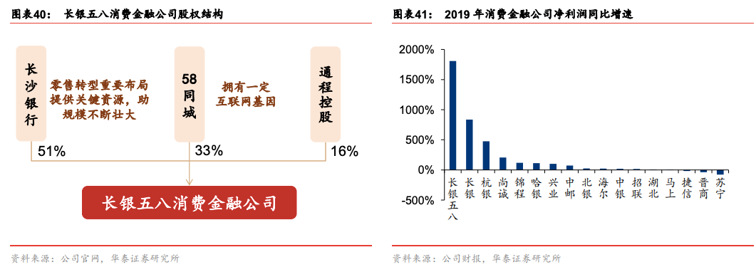 消费金融子公司助力区域性银行的零售业务转型,2020年多家消费金融公司成立。消费金融公司作为全国性牌照,可覆盖长尾客群,与银行零售客群形成互补,差异化发展零售业务,且产品设计、推广等方面也更为灵活。2020年以来中国平安、小米集团、光大银行等巨头旗下的消费金融公司均已开业,牌照价值得到市场重视。长沙银行控股设立的长银五八消费金融公司在客户定位、产品组合、联动发展等方面与母行消费金融业务形成错位与互补格局。