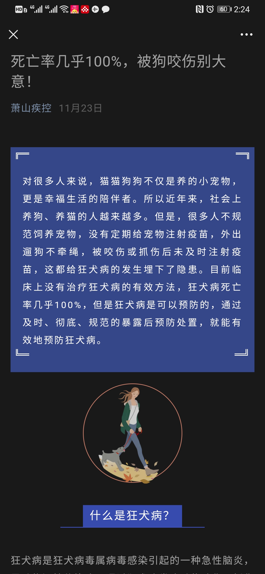 微信官方公众号“萧山疾控”于11月23日发布了一篇名为《死亡率几乎100%,被狗咬伤别大意!》的文章,其中介绍了狂犬病的来源、临床表现、危险暴露后的处理办法、预防办法以及萧山区犬伤门诊名单。