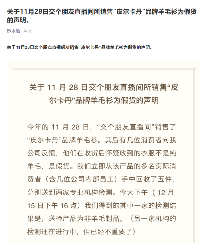 12月15日,罗永浩通过其个人微信公众号发布公告称,其11月28日销售的“皮尔卡丹”品牌羊毛衫,部分送检后鉴定为非羊毛制品,对此,罗永浩承诺对“所有购买该产品的消费者,代为进行三倍赔付”。
