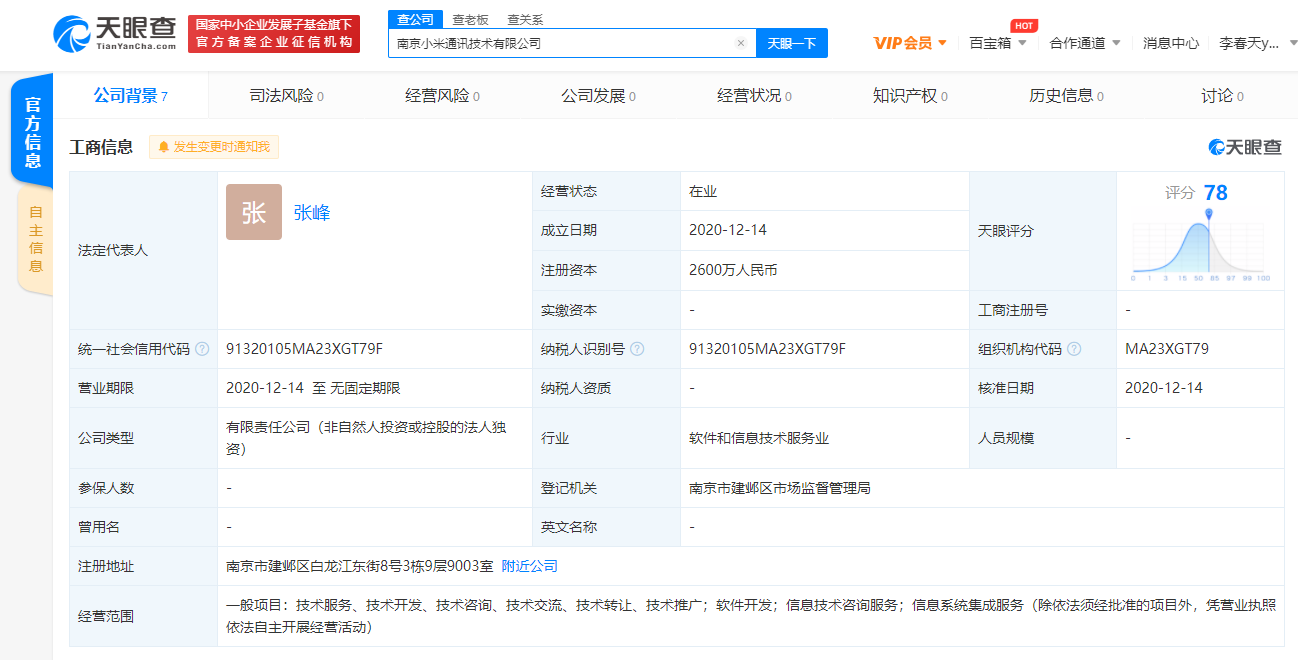 据天眼查APP显示,12月14日,南京小米通讯技术有限公司成立,法定代表人为张峰,注册资本2600万人民币,经营范围含信息技术咨询服务;信息系统集成服务等。该公司由小米通讯技术有限公司全资持股。