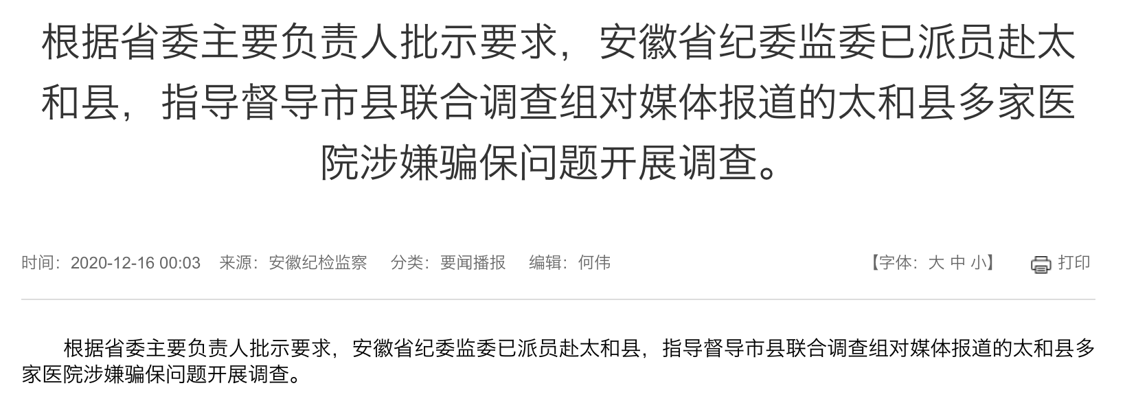 安徽省纪委监委也于同日凌晨发文,称已派员赴太和县,指导督导市县联合调查组对媒体报道的太和县多家医院涉嫌骗保问题开展调查。