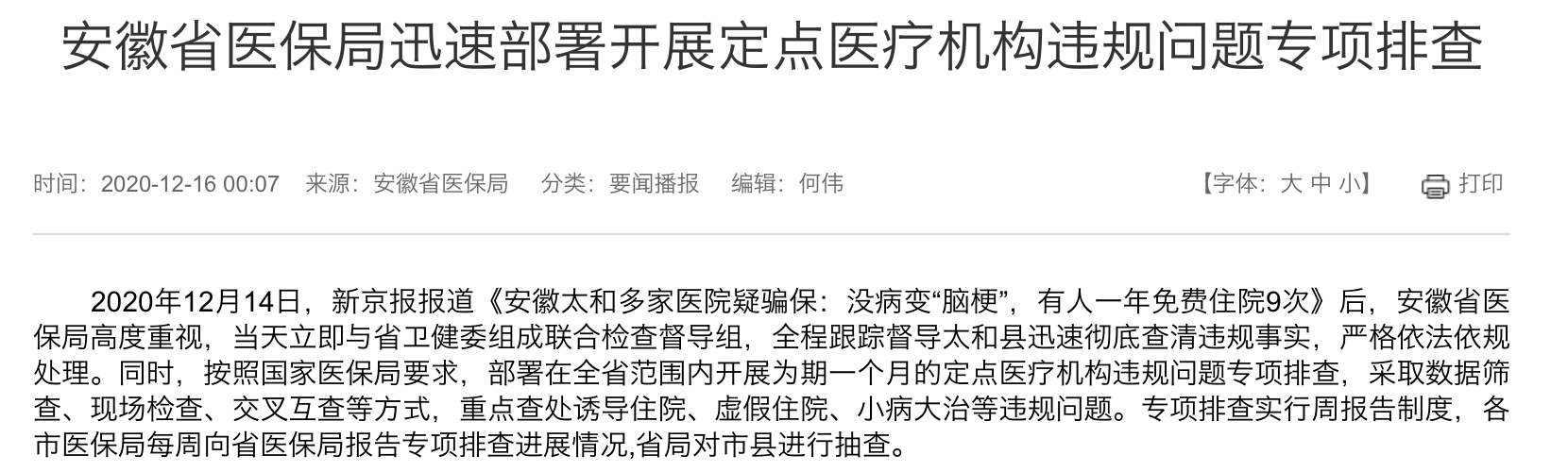 12月14日,《新京报》发布的一篇名为《安徽太和多家医院疑骗保:没病变“脑梗”,有人一年免费住院9次》的调查报道引起热议。