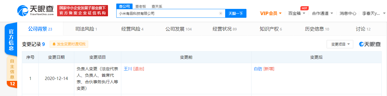 据天眼查APP显示,14日,小米有品科技有限公司发生工商变更,王川退出法定代表人,由白昉接任。该公司成立于2018年5月,注册资本1000万美元,经营范围含智能技术研发、Ⅰ类Ⅱ类医疗器械、玩具、工艺美术品、服装鞋帽、计生用品等。由Xiaomi HK Limited全资持股。