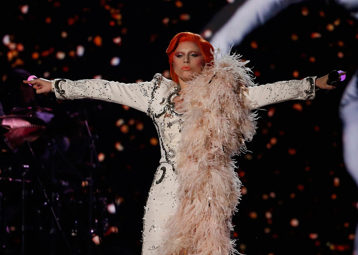 通过追踪Lady Gaga的面部表情,“数字化妆”的技术让多彩的影像投射到了她的脸上;她佩戴的智能指环能将她的动作指令实时传输;支撑着钢琴的机械手臂能自如地活动,呈现出更动态的效果;更神奇的是,科技还让现场生成了大卫·鲍伊的全息影像。