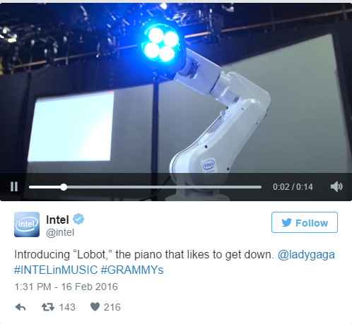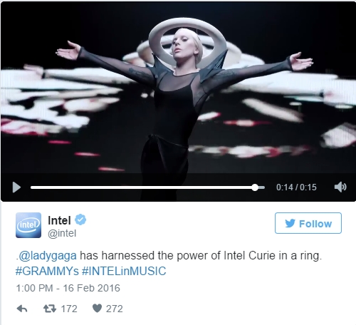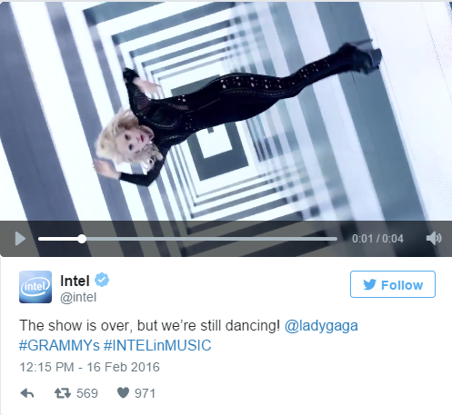 有如此酷炫的黑科技,英特尔自然要好好宣传一番。在颁奖过程中,其官方Twitter账号就在不停地发出此前Lady Gaga的采访视频,表达出对此次表演的期待:“艺术和科技的交融能创造出令人震撼的效果,和英特尔的合作十分新奇,给我带来了精彩的互动科技体验。”