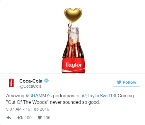 这样看来,可口可乐还是显得有诚意多了,在恭喜霉霉开场表演的同时,起码带了一张Taylor的昵称瓶图片。