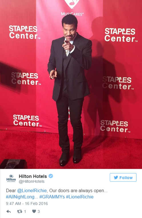 还有希尔顿酒店,对音乐人Lionel Richie说大门永远向他敞开。