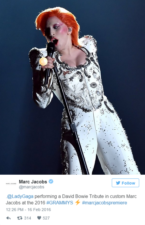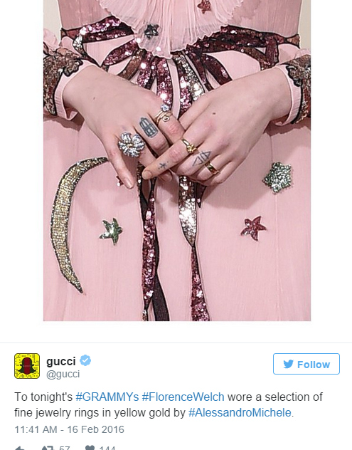 当然在这种红毯和表演场合,少不了明星们争奇斗艳的各种礼服,不少时尚大牌也在Twitter上晒出美图,骄傲地认领各家的服装珠宝。