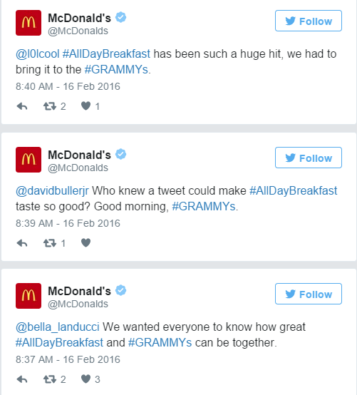 不断刷存在感的还有麦当劳,不过这次麦当劳并没有推出什么有创意的营销,而是不停地@好多人,带着格莱美的话题,拼命推销自己的全天候早餐。