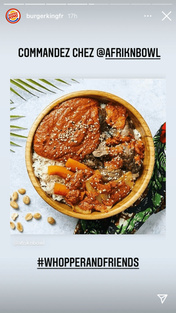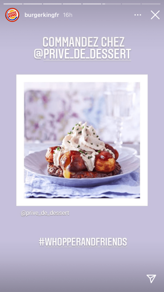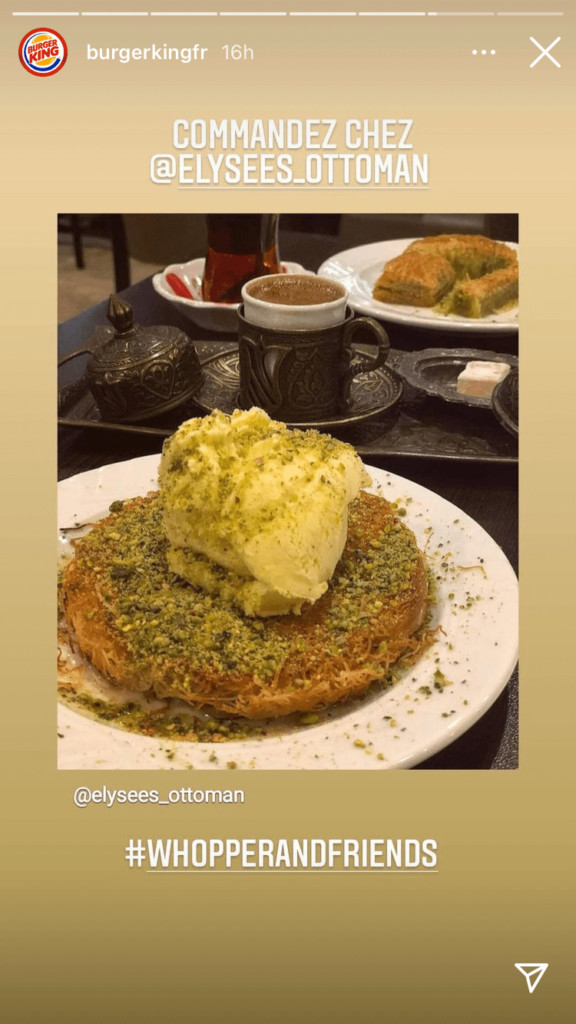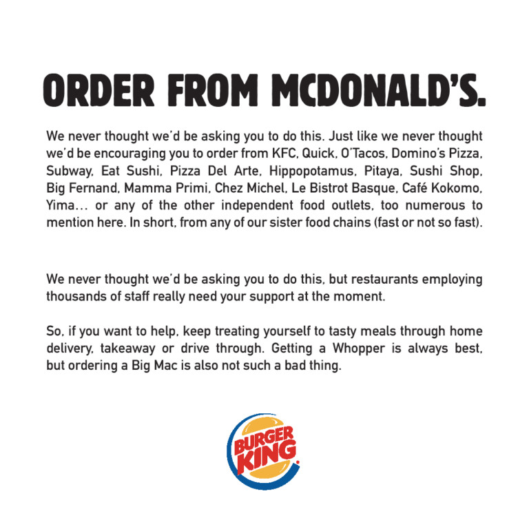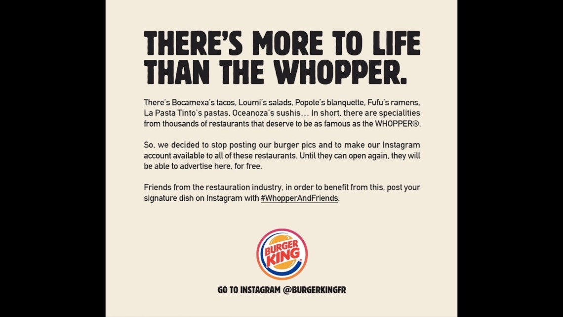 最近英国和法国的汉堡王在Instagram上发起一项活动,把自己的社交网络账号“借给”那些小餐厅,帮助其宣传。“有Roti King、Sultan’s palace、Tayyab’s、Eco、Dumplings Legend、Ochi’s……成千上万家餐厅的许多美味佳肴都值得与皇堡一样出名,”英国汉堡王在Instagram上写道,“随着我们进军更多的市场,独立餐厅显然需要更多支持。所以我们决定让大家从我们的汉堡图片中休息一下,让这些餐厅的图片能在社交网络上更多出现,在他们重新开张之前,他们可以免费在我们的Instagram上做广告。”