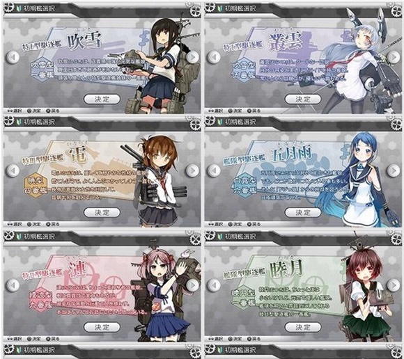 在舰娘选择界面,我们会发现初期舰娘数目比网页版有大幅增加,玩家可以从驱逐舰“吹雪”、“丛云”、“电”、“五月雨”、“涟”、“睦月”、“时雨”、“大潮”以及轻巡洋舰“川内”、“神通”、“那珂”中选取一位。虽然说选择轻巡洋舰会在让游戏初期稍微轻松一些,不过随着游戏的进行,错过的舰娘也都会一一收集到,因此即使按照玩家的喜好来选择初期角色,问题也不大。