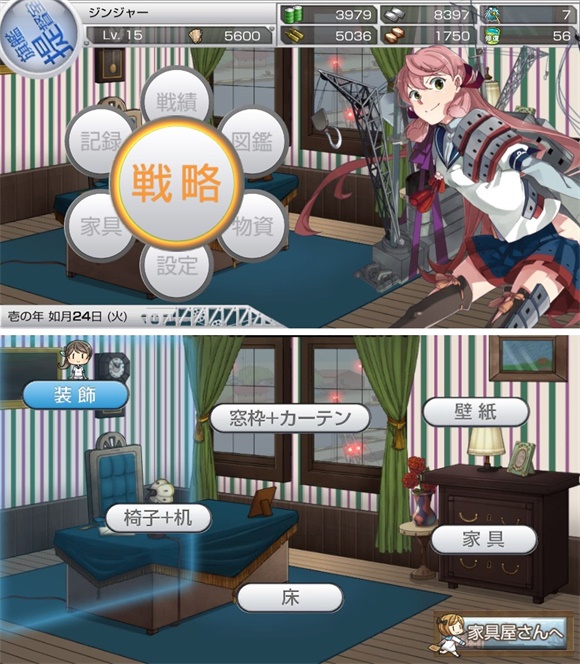 舰队“编成”、舰娘“改造”、“入渠”、“补给”、接受“任务”、进行舰娘的建造和兵器的开发……这些命令都在旗舰提督室里下达。如果点击中央的“战略”按钮,则会进入《舰队收藏改》的另一个主要部分——战略画面。