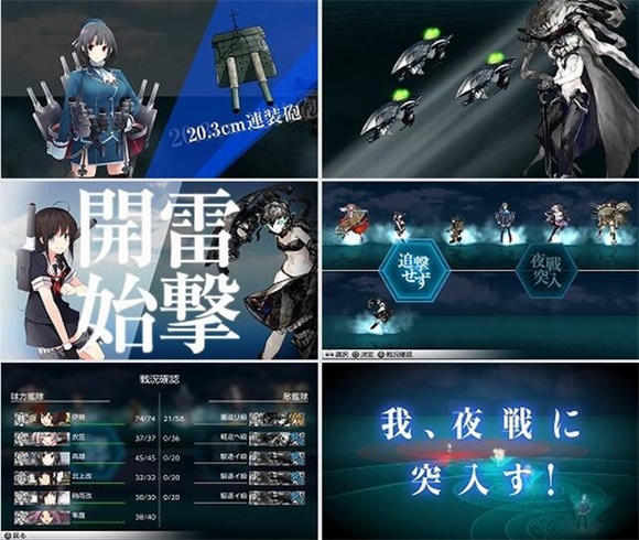 战斗开始时“阵型”的选择和网页版一样,但是接下来“战斗指挥”的命令输入就有很大不同。白天的战斗中舰队会采取怎样的行动,完全取决与此,并非如以前那样只要有航母在舰载机就会自动进行开幕攻击,或者只要有战舰在就会自动攻击两轮那样。因此,一边与敌人拉开距离一边疯狂地进行航空攻击,或者反过来发射鱼雷与敌人进行肉搏来赌一把等方式都是可行的,按照怎样的顺序下达命令才能取得更好的效果,这一点值得玩家细细研究。