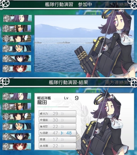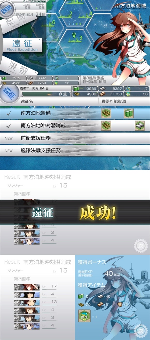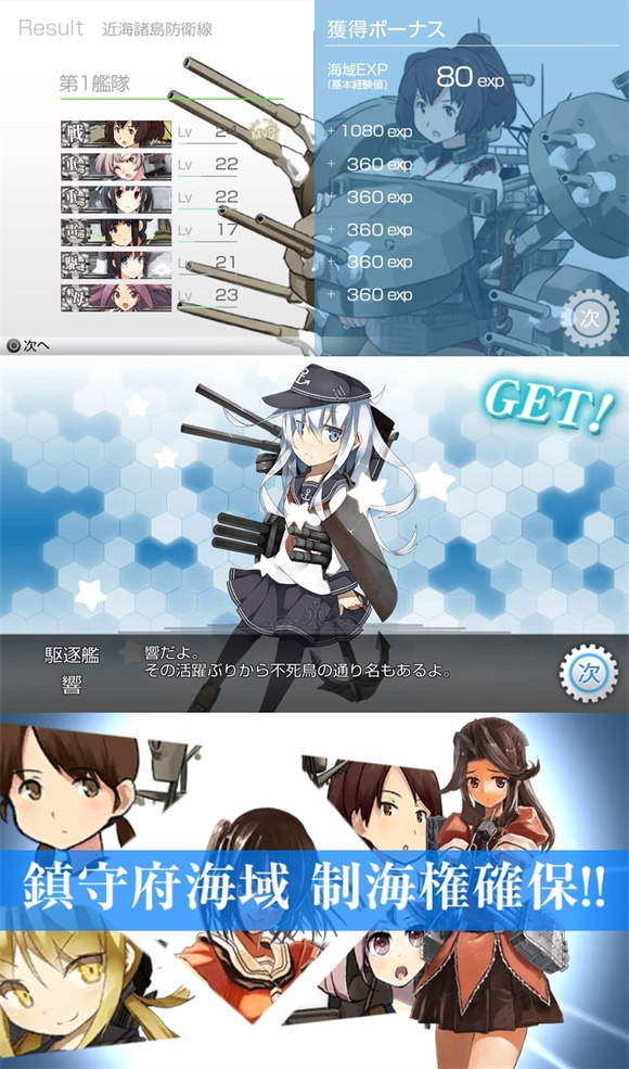 与网页版一样,结束战斗之后可以获得与战果和活跃度对应的经验值,胜利后还有几率碰见新的舰娘。完成了海域内的所有作战之后,就可以确保这片海域的制海权。