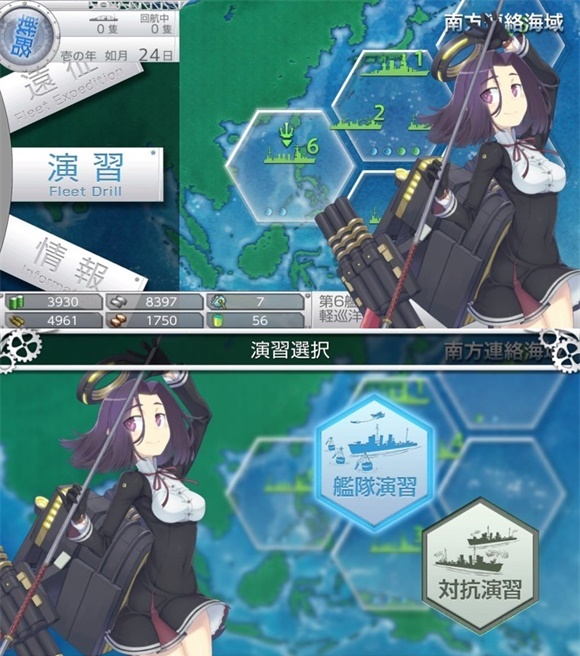 演习中的命令每个舰队1日只能执行1回,所有给舰队的指示完成之后,会有一个明显的“终了”命令。此外在战略画面中,各海域上包括“输送船团”在内,可以选择配备海上护卫舰队,在哪里配备、配备多少舰队,都会影响到每回合获得的资源量。
