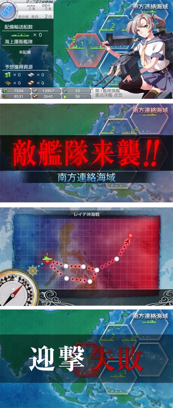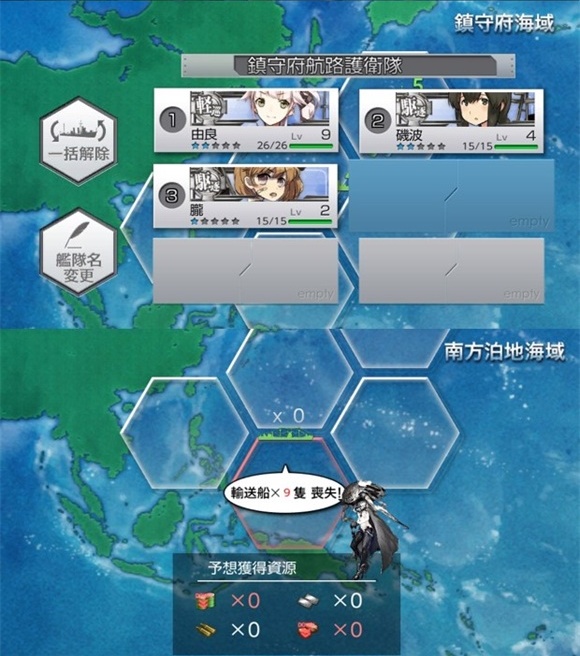 此外海上护卫舰队和进行出击、远征的舰队是分开编成的,因此每回合中海上护卫队完全无法出击,需要让别的舰娘来担当此任。在战力不足的游戏初期,也许先只给输送船团配备会更加有效。