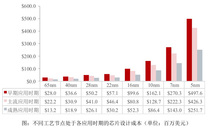 根据摩尔定律,半导体的芯片生产到10nm以下时,就会受到来自技术、设计和经济应用各方面的挑战。梁孟松主张将半导体工艺向3nm更低线宽演进的技术路径,在设备成本和设计成本上都体现了不经济性。设计方面,7nm的主流应用时期的单颗芯片研发成本相比28nm上升了近5倍。而在设备端,ASML的EUV光刻机更是一机难求。