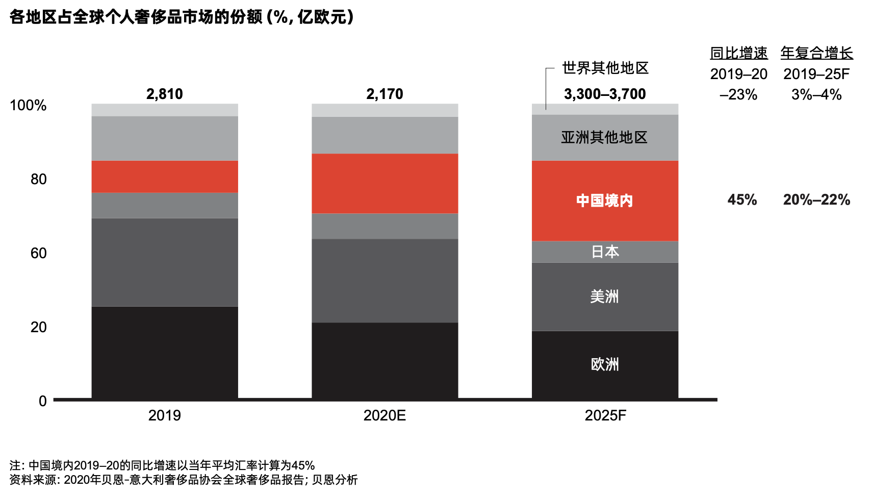 在疫情爆发前,奢侈品牌的境内消费占比通常在20%至50%不等。但今年由于疫情导致的出境受阻,中国消费者奢侈品境内消费占比或达70%-75%。该报告预计,随着全球形势恢复正常,这 一比例将在未来五年间下降。