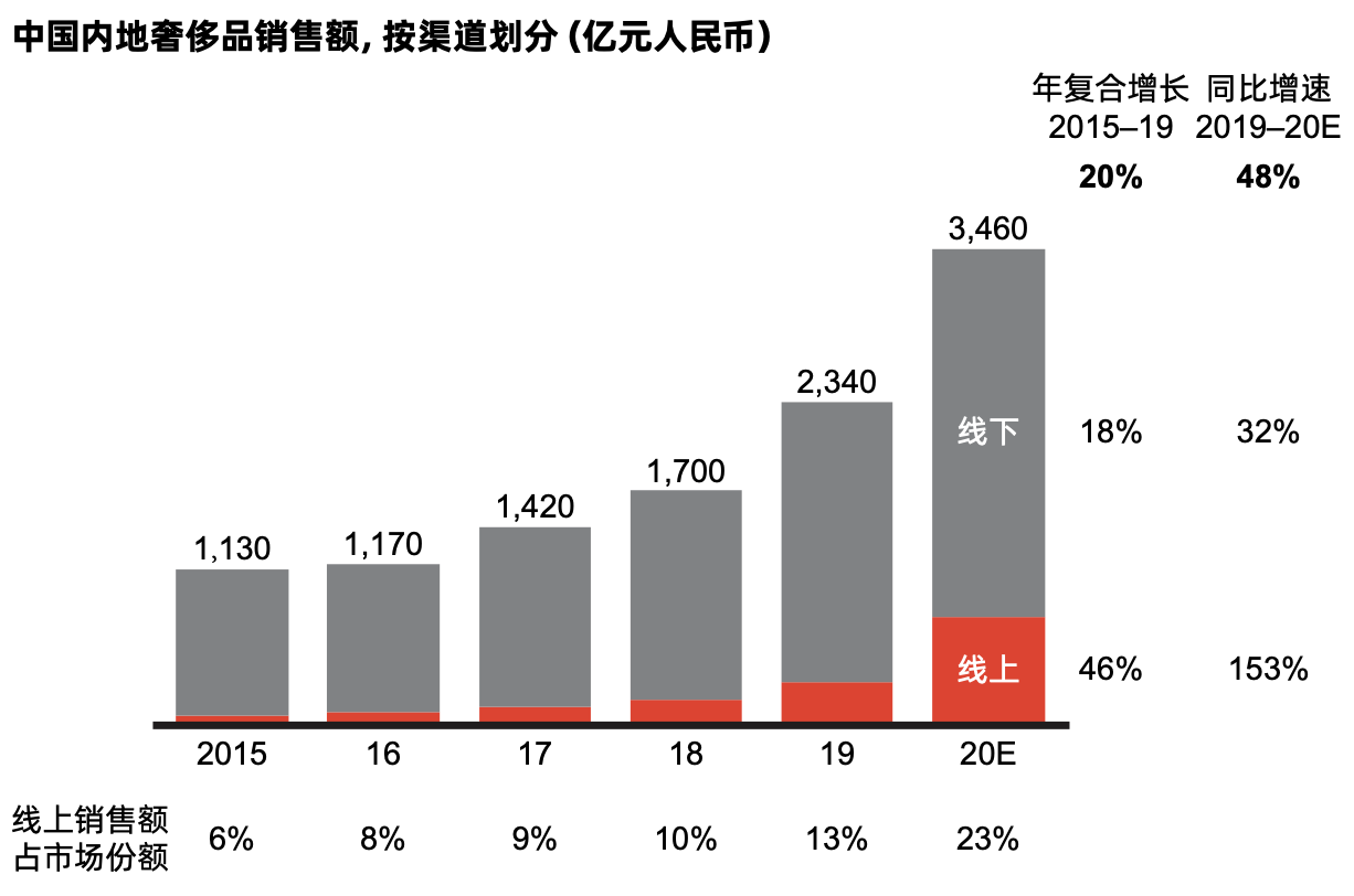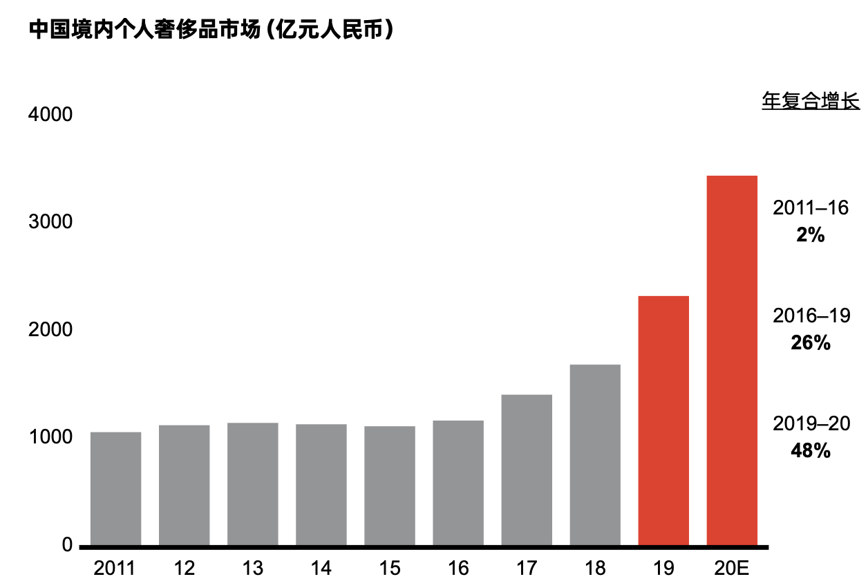 据报告,中国境内奢侈品市场从2020年4月开始回暖,预计2020全年将实现约48%的增长,达到近3460亿元人民币。