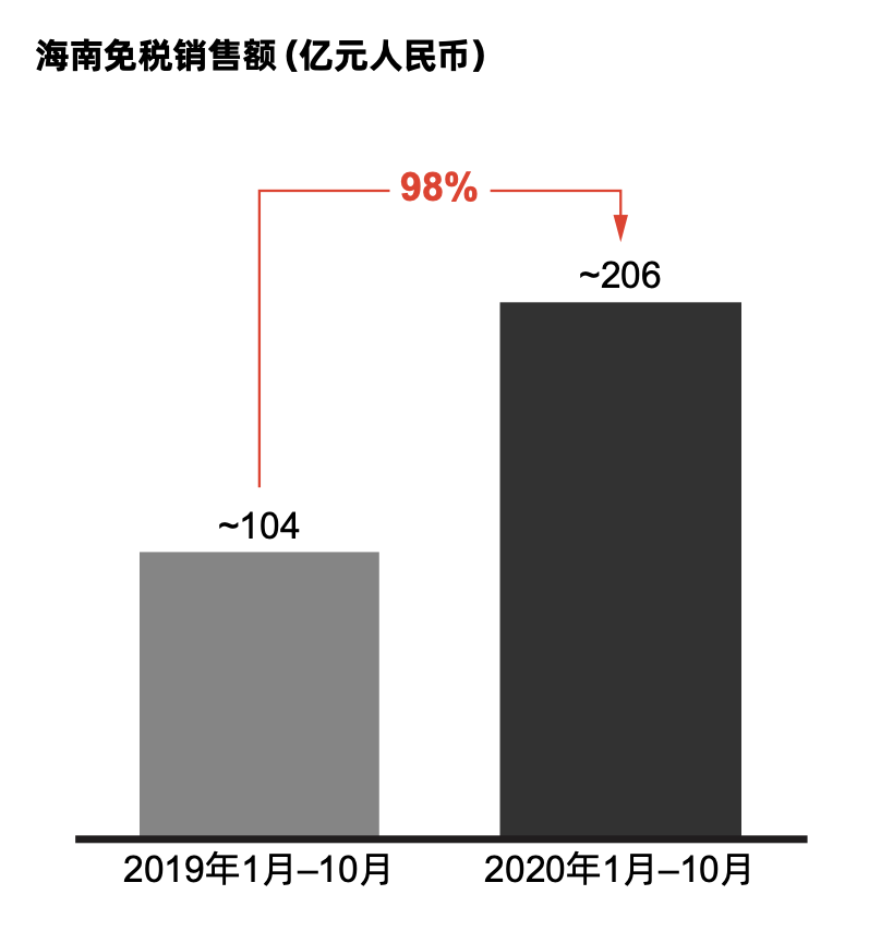 政策对于海南免税业务的支持加速了经济内循环,也促进了奢侈品的境内消费。据报告,截至2020年10月,今年海南免税销售总额达到约210亿元,同比增长98% 。